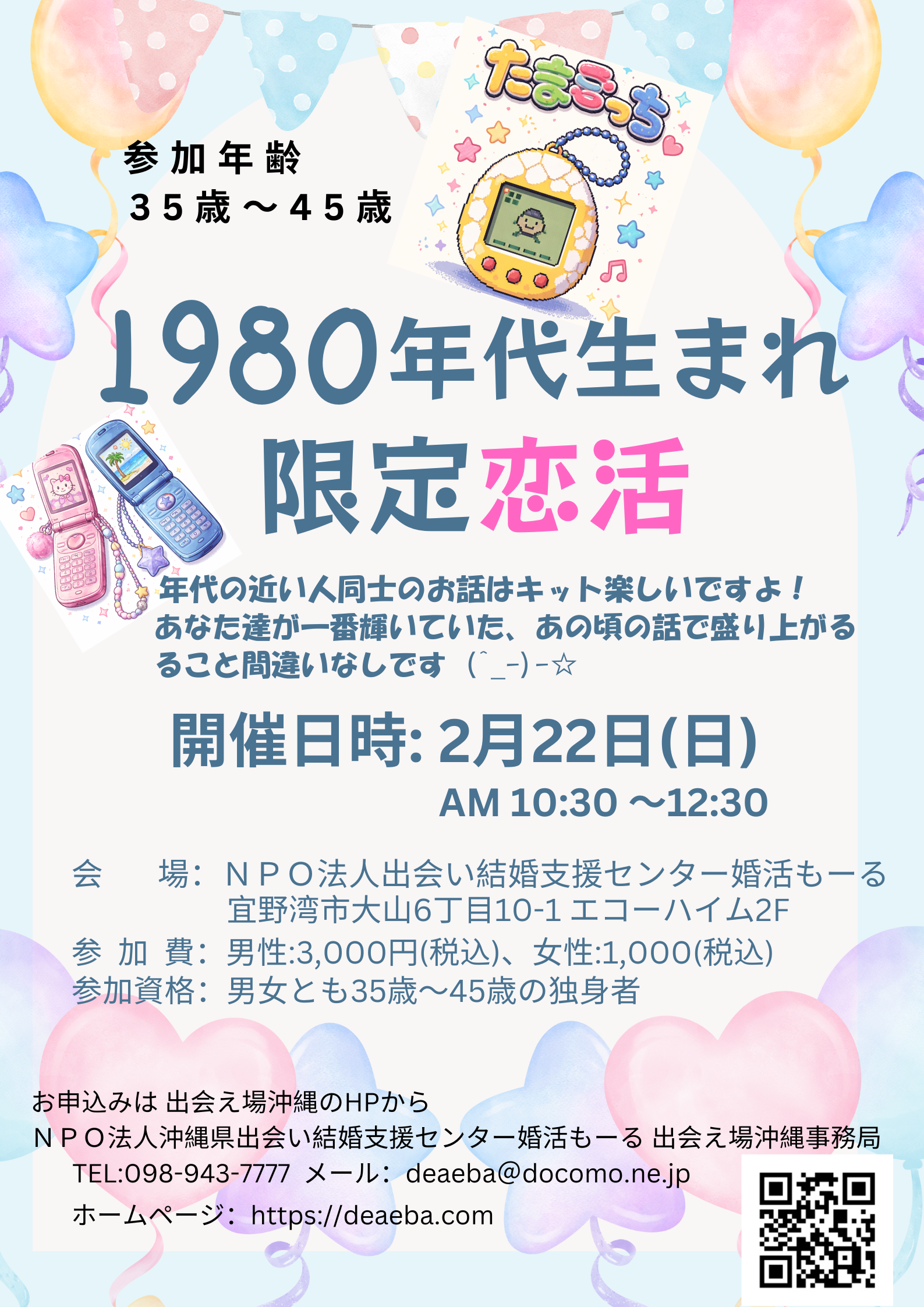 パーティーの内容や予約についての問合せは、出会え場沖縄事務局までお電話(098-943-7777)か、問合せフォームにてお願いします。